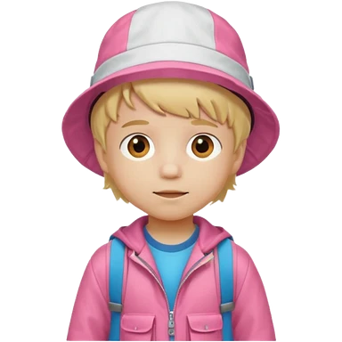 A little boy student white skin, blonde hair, with white bucket hat, orange jacket, pink backpack emoji