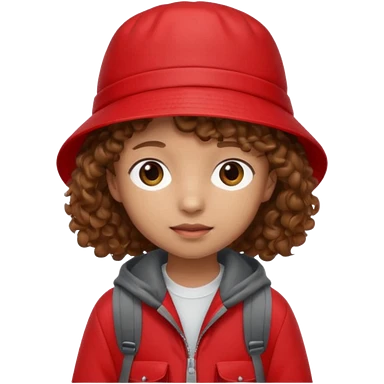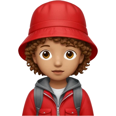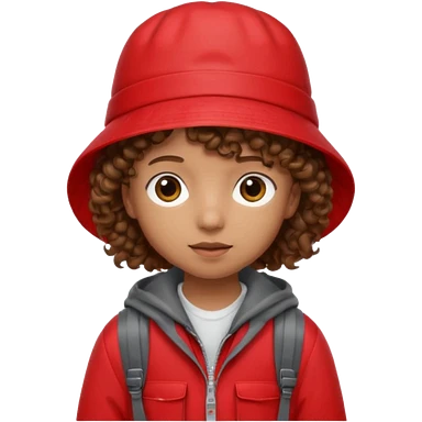 Little student brown curly hair, wears red bucket hat and jacket, backpack, shy emoji