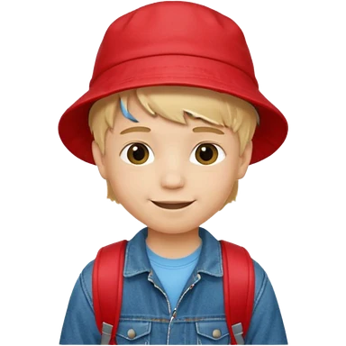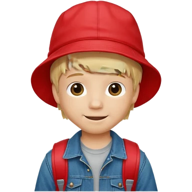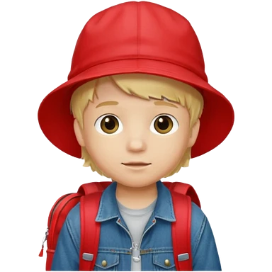 A little boy student, blonde hair, with red bucket hat, jean jacket, backpack emoji