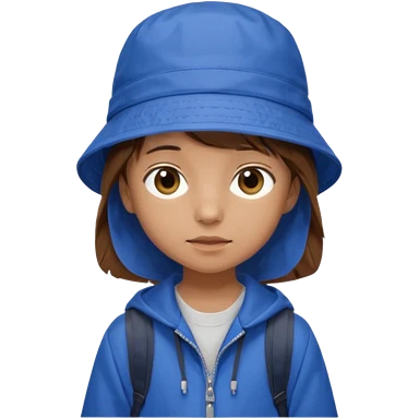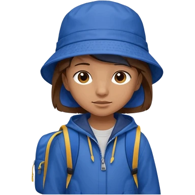 Little student, brown hair, wears blue bucket hat and jacket, backpack, shy emoji