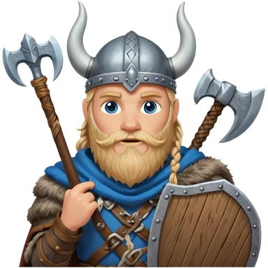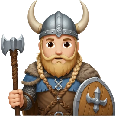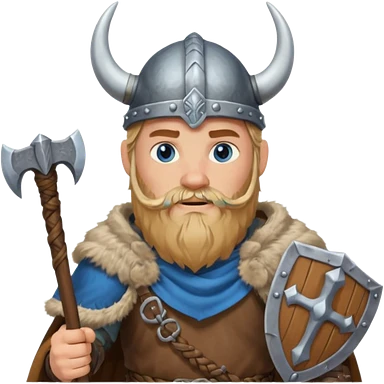 A tall Viking with braided blond beard, fur cloak, and heavy axe resting on his shoulder with horned helmet emoji
