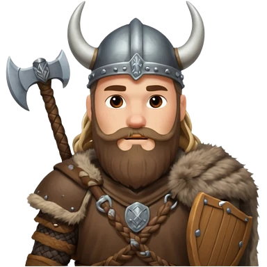 A tall Viking with braided beard, fur cloak, and heavy axe resting on his shoulder with horned helmet emoji