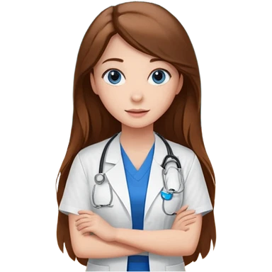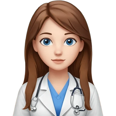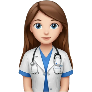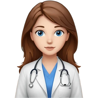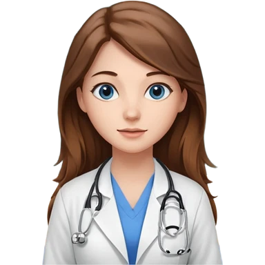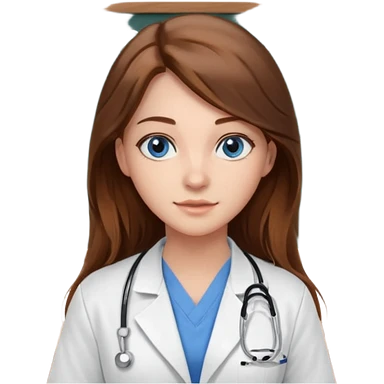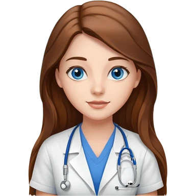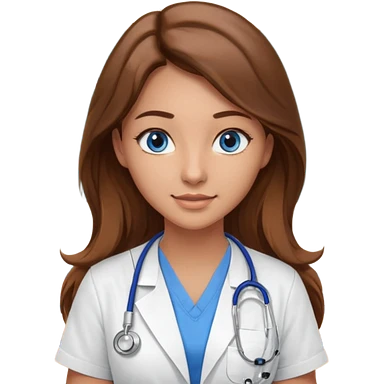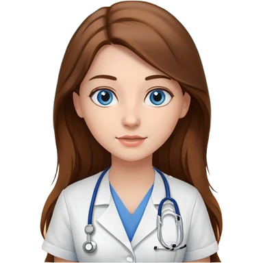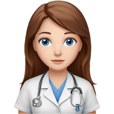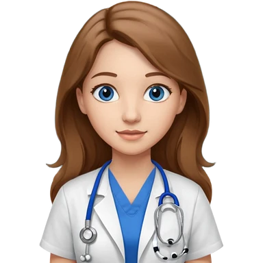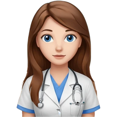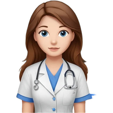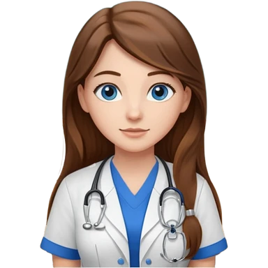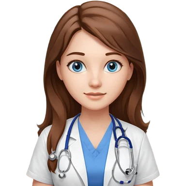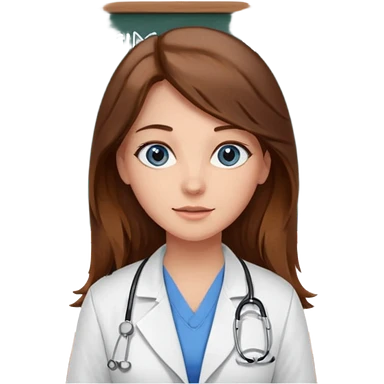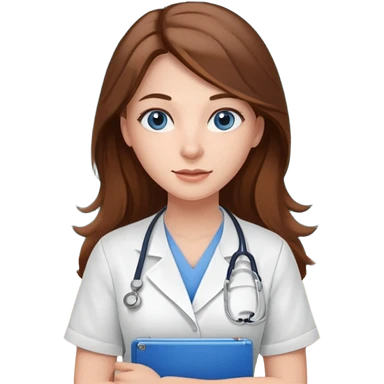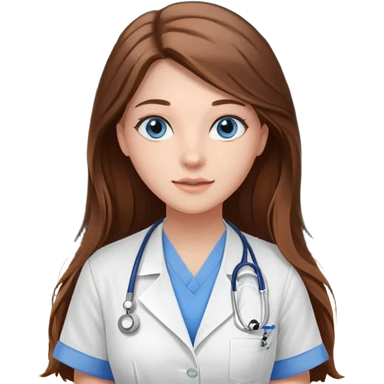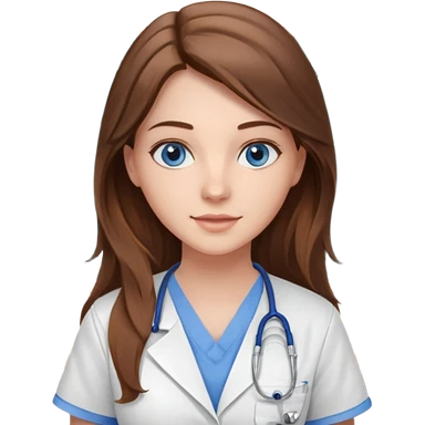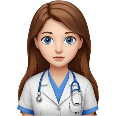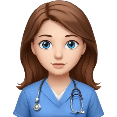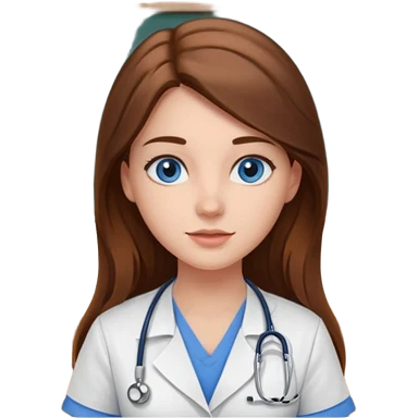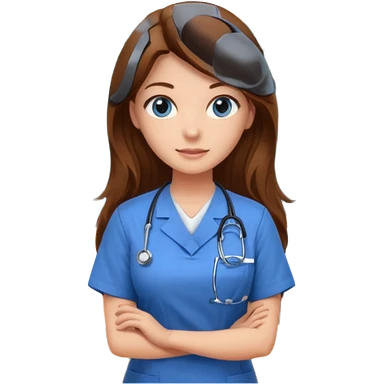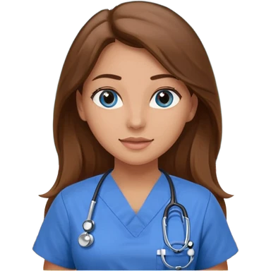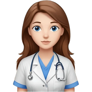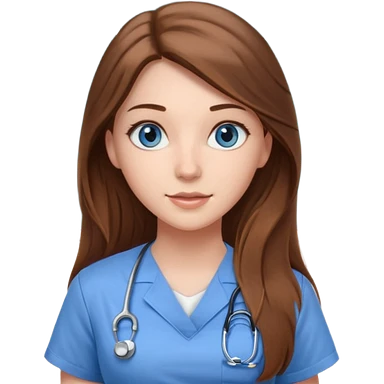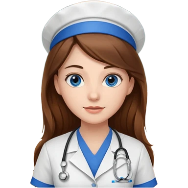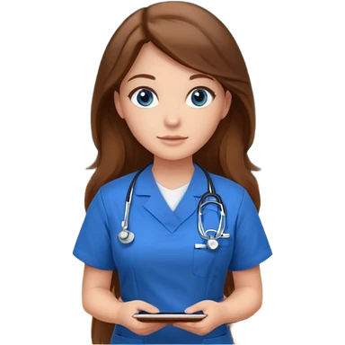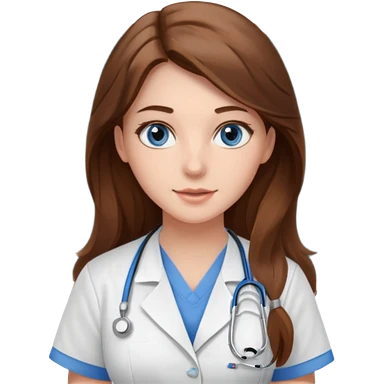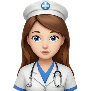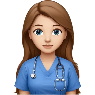 nurse with bright long straight red hair, with amber eyes, shes wearing a nursing uniform that is white with a little red logo of UL...shes holding a needle emoji