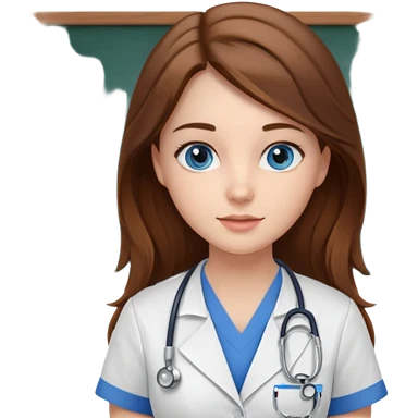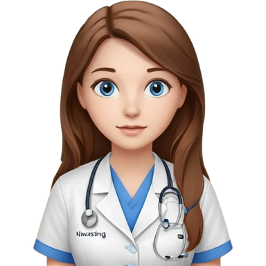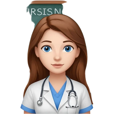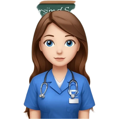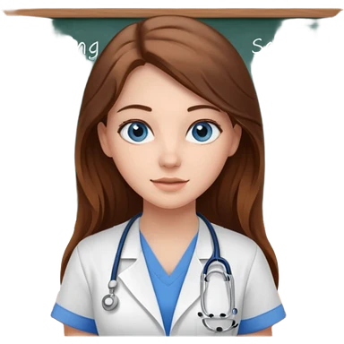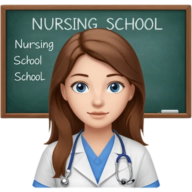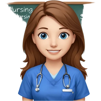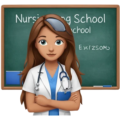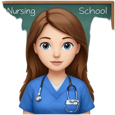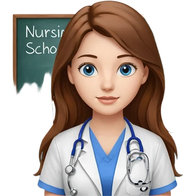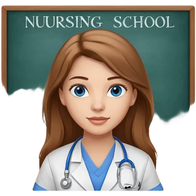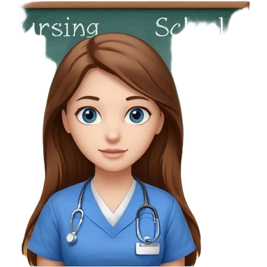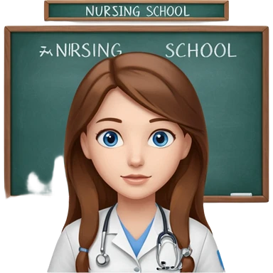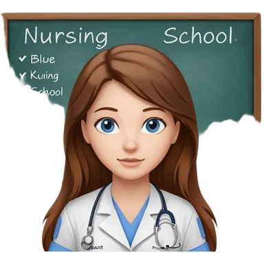 inside a classroom at university that says nursing school on the board with a pretty female nursing student with long brown hair, blue eyes emoji