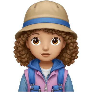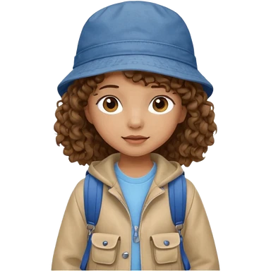 A little girl student curly brown hair, with jean bucket hat, beige jacket, blue backpack emoji