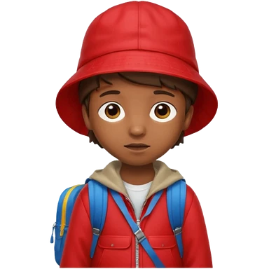 A little student with red bucket hat, jean jacket, backpack emoji | AI Emoji Generator
