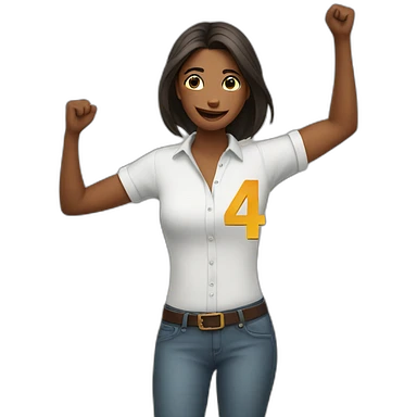 woman wearing a shirt with a horse and the number 54 on it. She has her hands in the air to celebrate emoji