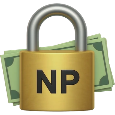 A gold lock that says “NP” in black with money in hands and green dollar sign eyes emoji