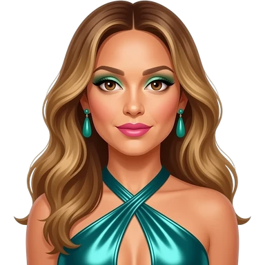 Jennifer Lopez with brown eyes, long golden brown hair, sea green eyeshadow, hot pink lipstick, sea green metallic halter dress, green earrings emoji