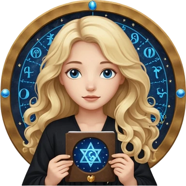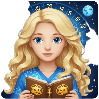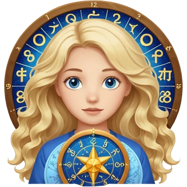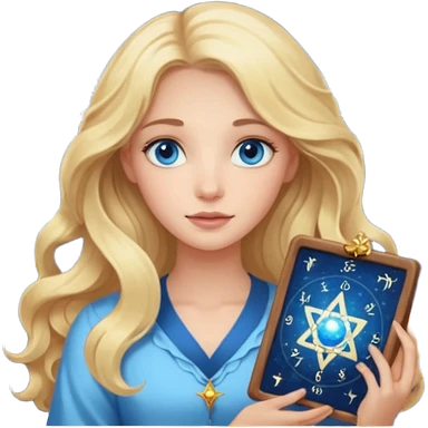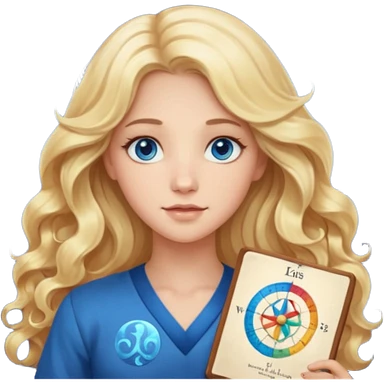 A long wavy haired blonde girl with blue eyes holding a astrology natal chart. emoji