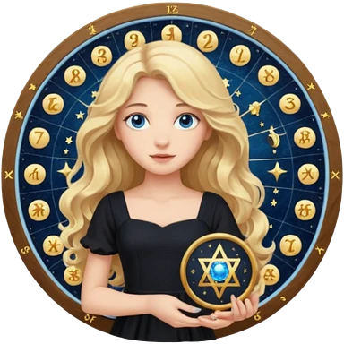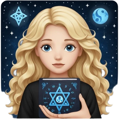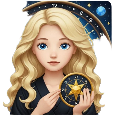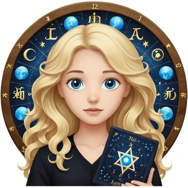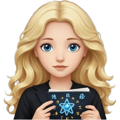 A long wavy haired blonde girl with blue eyes, wearing black, holding astrology natal chart. emoji