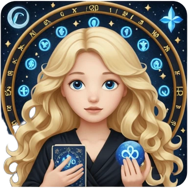 A long wavy haired blonde girl with blue eyes, wearing black, with a scarf on, holding astrology natal chart paper emoji | AI Emoji Generator