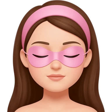 A woman with brown hair, eyes closed, calm and neutral expression, not smiling, wearing a pink headband, wearing pink eye patches under her eyes, simple emoji style, flat 2D render, pastel colors, white background emoji