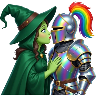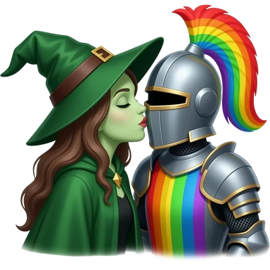 A green cloaked witch with pale skin kissing a rainbow knight without a helmet emoji