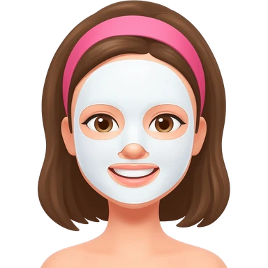 A smiling woman with brown hair, wearing a pink headband, wearing a white sheet mask, simple emoji style, flat 2D render, pastel colors, white background emoji