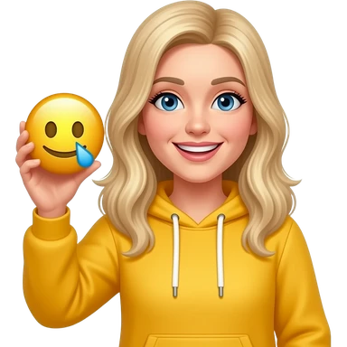 A 30-year-old blonde woman in a yellow hoodie smiles and shows emoji a ‘Face with Diagonal Mouth’ emoji