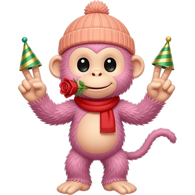 a light pink monkey with no legs wearing a red scarf, peachy colored beanie, mini green and gold striped party hats on the tips of its 3 fingers on each hand, and a rose is its mouth emoji