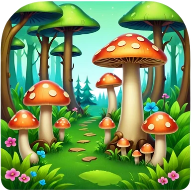 A stylized fantasy forest with glowing mushrooms and colorful tree emoji