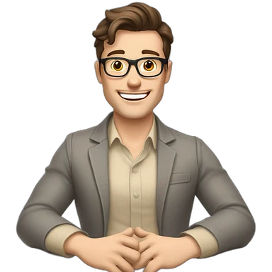 Joyful Celebrating victory Pale skinned Fit Man With dark brown hair in gray jacket, beige office shirt, Brown pants and vintage glasses sitting In a soft chair with a notebook and a pen emoji
