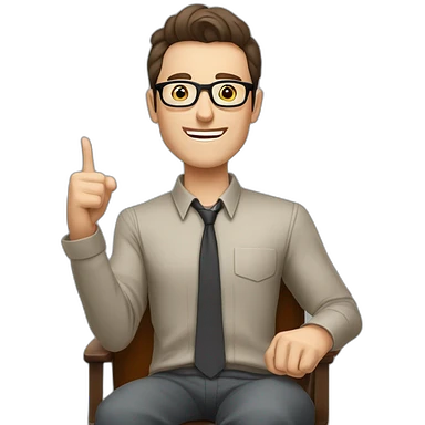 Joyful Celebrating victory thrumb up Pale skinned Fit Man With dark brown hair in gray jacket, beige office shirt, Brown pants and vintage glasses sitting In a soft chair emoji
