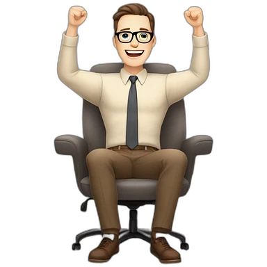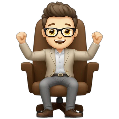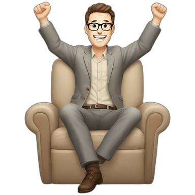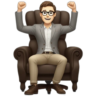 Joyful Celebrating victory Hands up Pale skinned Fit Man With dark brown hair in gray jacket, beige office shirt, Brown pants and vintage glasses sitting In a soft chair emoji