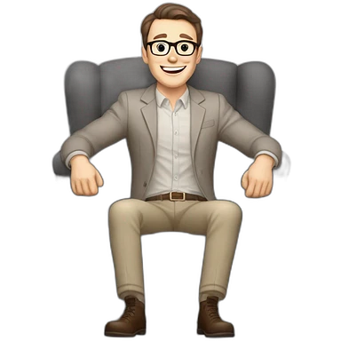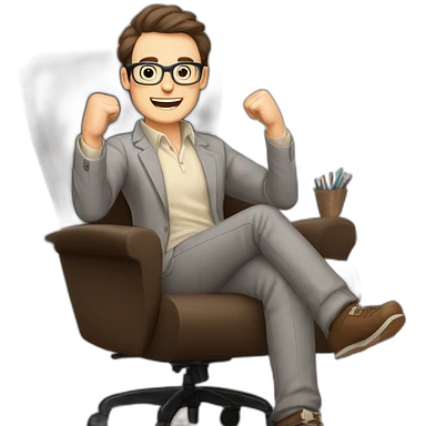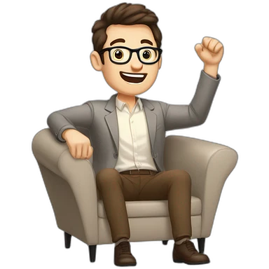Joyful Celebrating victory Pale skinned Fit Man With dark brown hair in gray jacket, beige office shirt, Brown pants and vintage glasses sitting In a soft chair emoji
