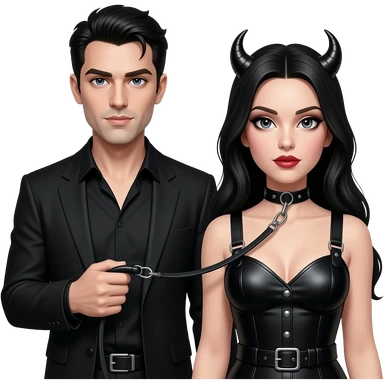 a woman confidently holding a leash attached to a man, playful and lighthearted scene, emoji style, no background emoji
