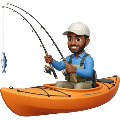 a black fishermen in an orange kayak wearing a blue long sleeve shirt and white baseball hat, with 2 fishing poles both bent with fish on them emoji