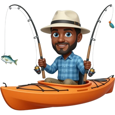 a black fishermen in an orange kayak wearing a blue long sleeve shirt and white hat, with 2 fishing poles both bent with fish on them emoji