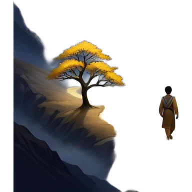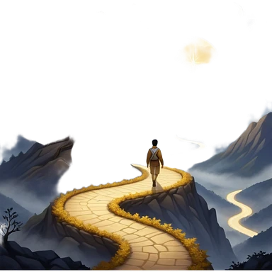 A man walks a winding path from a dark, foggy landscape filled with shadows toward a glowing mountaintop. A light grows in his chest as he follows his intuition. Along the way, he passes symbols of ambition and emptiness, until he reaches a golden tree under a starry sky, and ready to uplift others. emoji