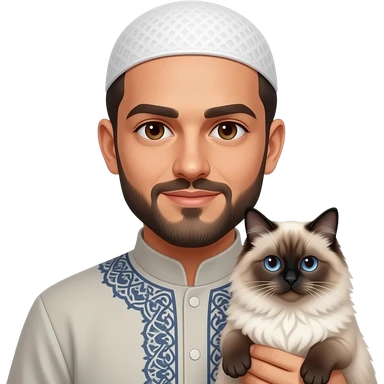 An albanian muslim man with brown eyes and a goat beard holding a ragdoll cat emoji