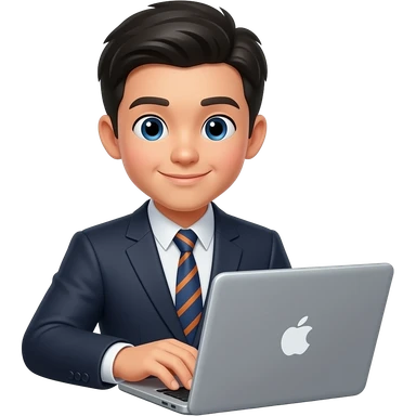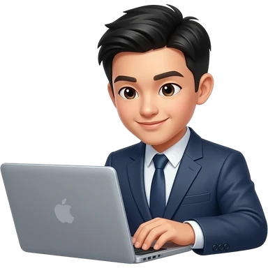 asian teenager behind a laptop typing up, wearing a suit, camera angle is in the front emoji