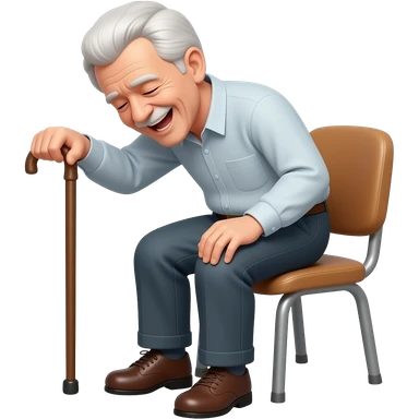 side view of an old man sitting in a chair holding a walking stick laughing with his head bent down and his hand slapping his knee. emoji