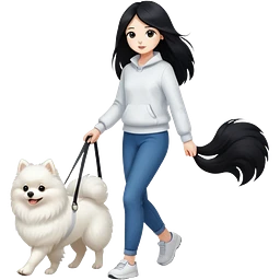 a 32-year-old man with pale skin and black hair going for a walk with a female 9-year-old Bichón Frisé dog. emoji