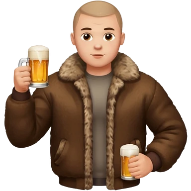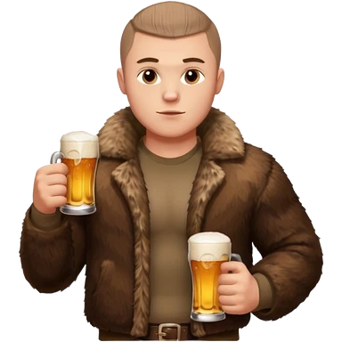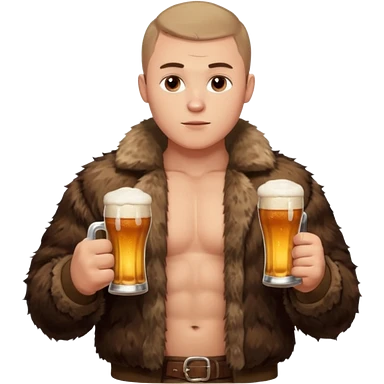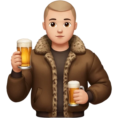 „A strong Russian young man with a buzz cut, muscular build, wearing a bear fur coat, holding a beer in one hand, confident expression, snowy background, Slavic aesthetics emoji