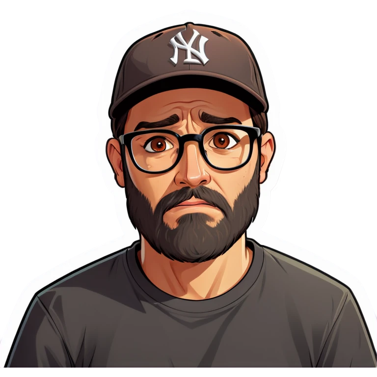A man with a grey baseball cap, hazel eyes, big dark brown beard and glasses, crying image | AI Emoji Generator