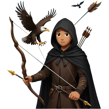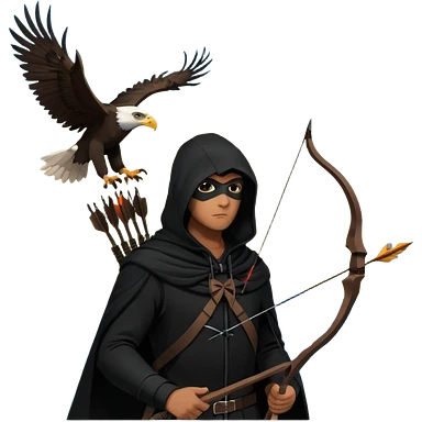 hooded man in a tall buliding a silloute shot, bow and arrows in hand. in the sky a big eagle is flying in modern time emoji