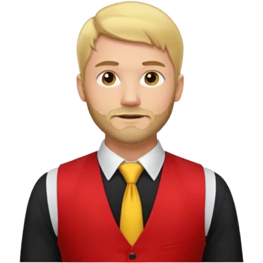 A blond man wearing a black dress shirt, red tights, and a yellow tie. A red vest over his black shirt. A blond man with dark blond hair and a short beard. His outfit consists of a black shirt, a red vest over it, and a yellow tie. emoji