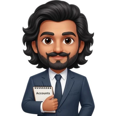 create emoji of man with middle parting and curtains like hair wearing business suit with accounts notebook and the man has middle parting and of indian origin with facial hair only on chin and mustache emoji
