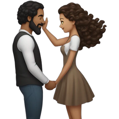 Brown man with a smooth black hair and a black beard kissing a white woman with long brown curly hair emoji