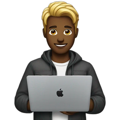 Emoji of a stylish blonde-haired man with a modern haircut, using a MacBook and wearing AirPods. Apple-style, clean design, confident expression. emoji