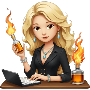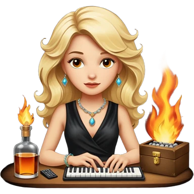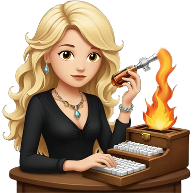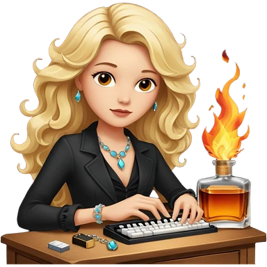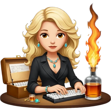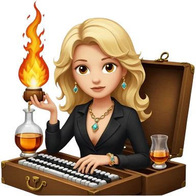A sketchnote illustration rendered in a strong moody style, featuring a blonde woman with cascading gorgeous hair, a keyboard, a whiskey bottle, a key, a jewelry box, and fire elements against a black background. The lighting is low with low contrast, emphasizing dramatic shadows. emoji