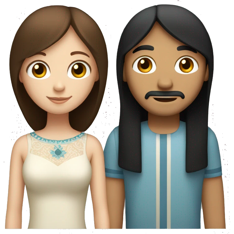 a married couple standing beside eachother, one has pale skin and long straight ginger hair with bangs and blue eyes, the other person is a man that is mexican and has straight chin length black hair with brown eyes emoji | AI Emoji Generator