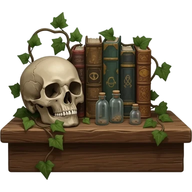 victorian still life arranged on a wooden board, includes a corpse's head, tiny dusty bottles, old battered books, some wrapped ivy emoji