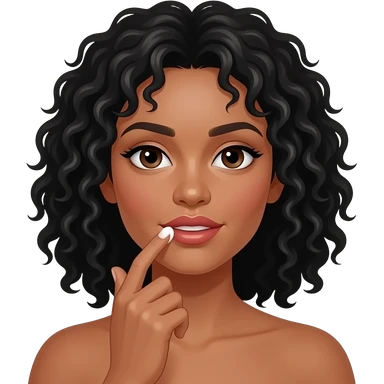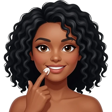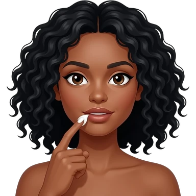 Medium dark skinned woman with black curly shoulder-length hair spreading cream on top of her lips with her finger. emoji