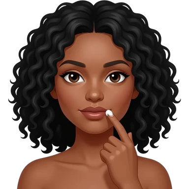 Medium dark skinned woman with black curly shoulder-length hair spreading cream above her lips with her finger. emoji