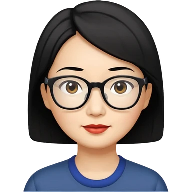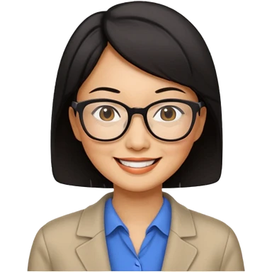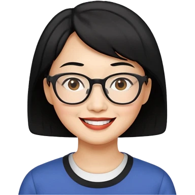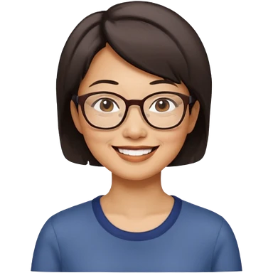 a middle-aged Asian woman with short hair wearing glasses and an impression emoji