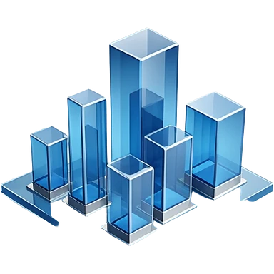 A minimalist 3D illustration of abstract glass buildings in blue tones, made of transparent glass-like materials with soft lighting and subtle reflections, isometric perspective, white background, futuristic architecture concept, volumetric light, clean render, high detail, no textemoji