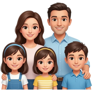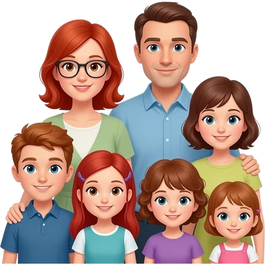 a mom dad with 6 kids 4 girls 2 boys and older sister with red hair and clar glasses a 10 year old brother with brown hair a 7 year old sister with red hair a 5 year old brother with red hair a 3 year old sister with short curly red hair and a 1 year old girl with brown hair emoji | AI Emoji Generator