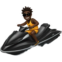 Guy with long Blonde hair, guy with bald head, guy with short brown hair, riding a jet ski with 3 surf boards emoji